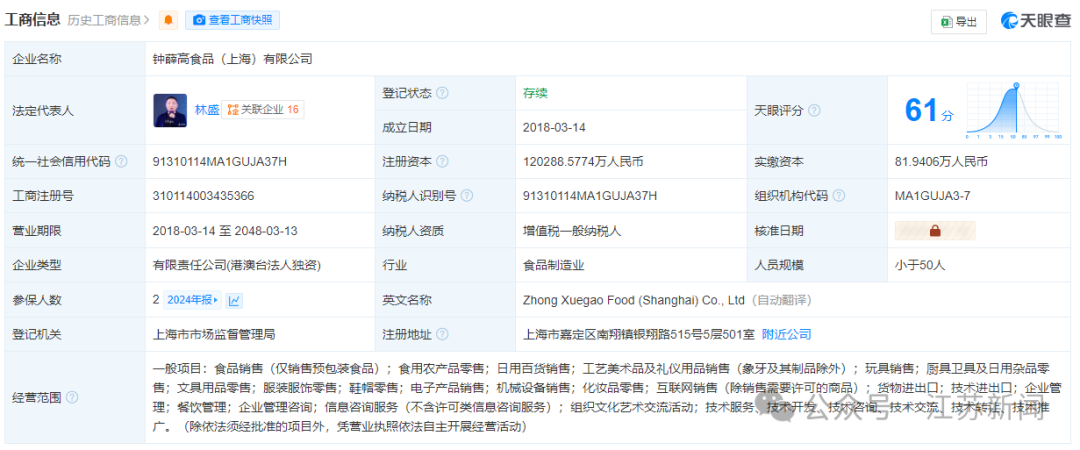 钟薛高食品(上海)有限公司成立于2018年3月,法定代表人为林盛,注册资本约12.03亿人民币,经营范围含食品销售、食用农产品零售、日用百货销售、工艺美术品及礼仪用品销售、互联网销售、餐饮管理、企业管理咨询等,由Gloryseed HK Limited全资持股。