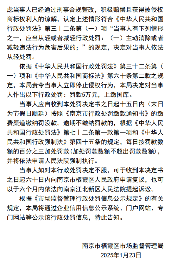 依据《商标法》第六十条和《行政处罚法》第三十二条,监管部门综合考虑其整改态度,最终作出责令停止侵权、罚款5万元的处罚决定。
