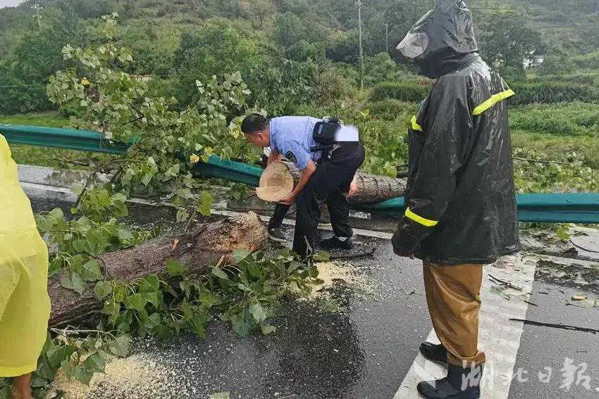 “警察同志,赵家套这边的路被树堵死了,雨下得又大,你们快来看看吧!”8月25日下午2时许,三里畈派出所接到群众报警求助,称辖区内318国道赵家套路段旁一棵大树被风吹倒,树干横亘在道路中央,导致过往车辆无法正常通行。