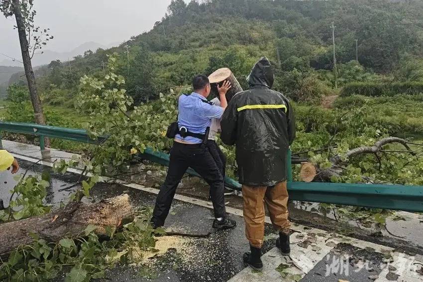 近日,罗田县三里畈镇突降暴雨,因树木倒伏导致道路拥堵,三里畈派出所民警快速响应好牛,及时清理路面障碍,保障了群众的出行安全。