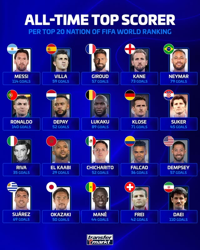 虎扑09月08日讯 德转盘点FIFA排名前20的国家队队史射手王竹演配资,其中梅西114球,C罗140球。